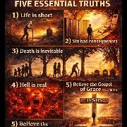 FIVE ESSENTIAL TRUTHS THAT DEMAND A GOSPEL RESPONSE INTRODUCTION (WHY THIS MESSAGE MATTERS) The image before us presents eternal realities, not emotional opinions. These truths cut across every generation and every dispensation, yet must be understood rightly divided (2 Timothy 2:15).In the Dispensation of Grace, God is not calling sinners to works, rituals, or religious