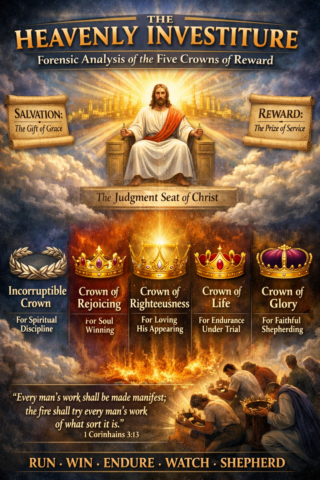 The evidence gathered in this forensic investigation is conclusive: Salvation is a finished work, but the “Prize” is a finishing work. The “Five Crowns” serve as the “divine decorations” for a life lived “unto him which died for them, and rose again” (2 Corinthians 5:15).