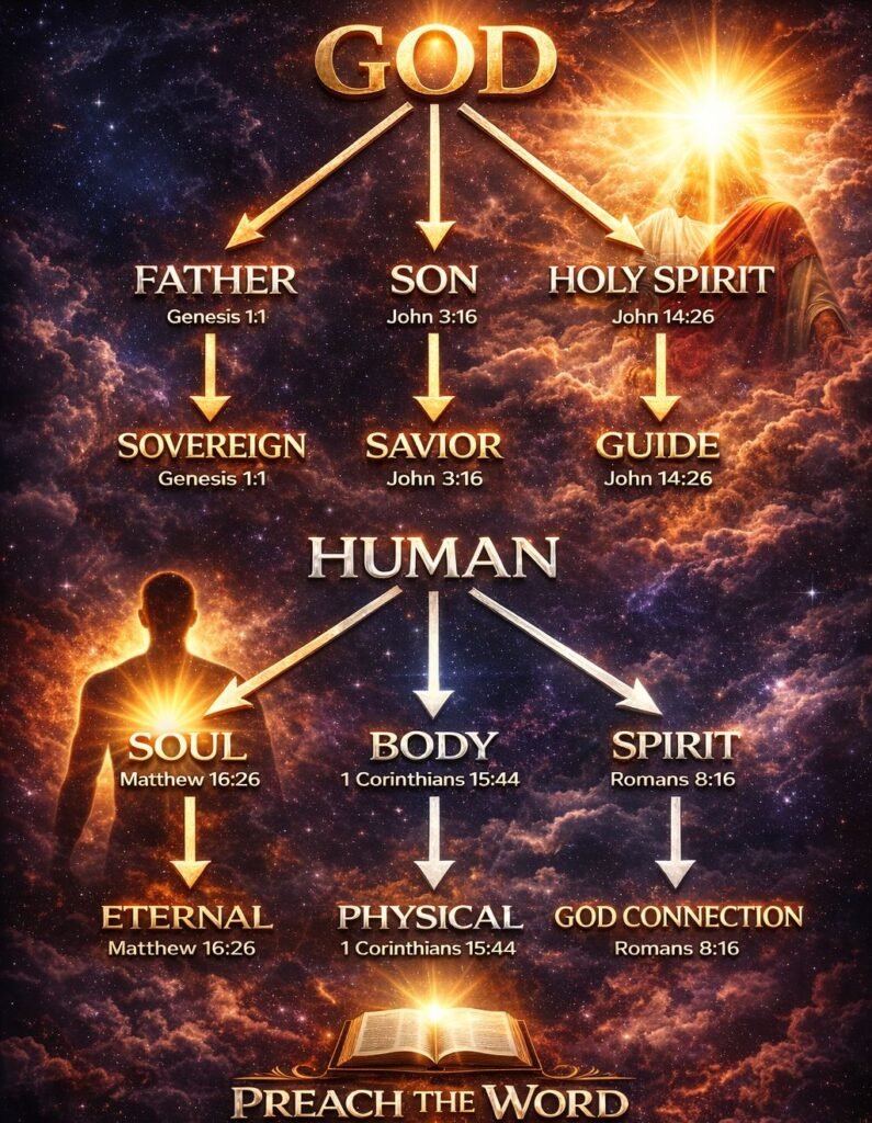 As we “rightly divide the word of truth” (2 Timothy 2:15), we must identify that understanding God rightly leads to understanding man rightly, and understanding man rightly leads to the appreciation of salvation in its pristine purity. This inquiry will analyze the seven-fold forensic architecture of existence, moving from the Sovereignty of the Father to the Eternal Security of the Saved. We shall prove that God is a God of order, and that He has provided a complete rescue mission for the entirety of the human tripartiteβbody, soul, and spirit.