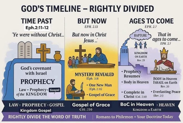 Confusion comes when believers mix these programs. Clarity comes when we rightly divide the Word of Truth (2 Tim. 2:15). This outline will walk through Godโs timeline and show where we are today, what applies to us, and what is yet to come.