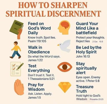 Spiritual discernment is the believerโs safeguard in this age of deception. Without it, churches fall into error, Christians into carnality, and ministries into corruption. But with sharpened discernmentโthrough Scripture, Spirit, prayer, and wisdomโthe believer can walk in truth, stand against error, and glorify Christ.