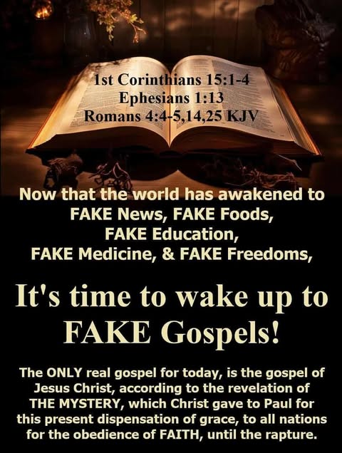 We live in an age where many so-called โgospelsโ are preached: prosperity gospel, works-based gospel, kingdom gospel, social gospel, and emotional gospel. But Paul warned of another gospel (Galatians 1:6โ9). The only true gospel for this dispensation is the gospel of the grace of God revealed to the Apostle Paul (Acts 20:24; 1 Corinthians 15:1โ4). It is time to wake up, discern, and reject fake gospels that cannot save.