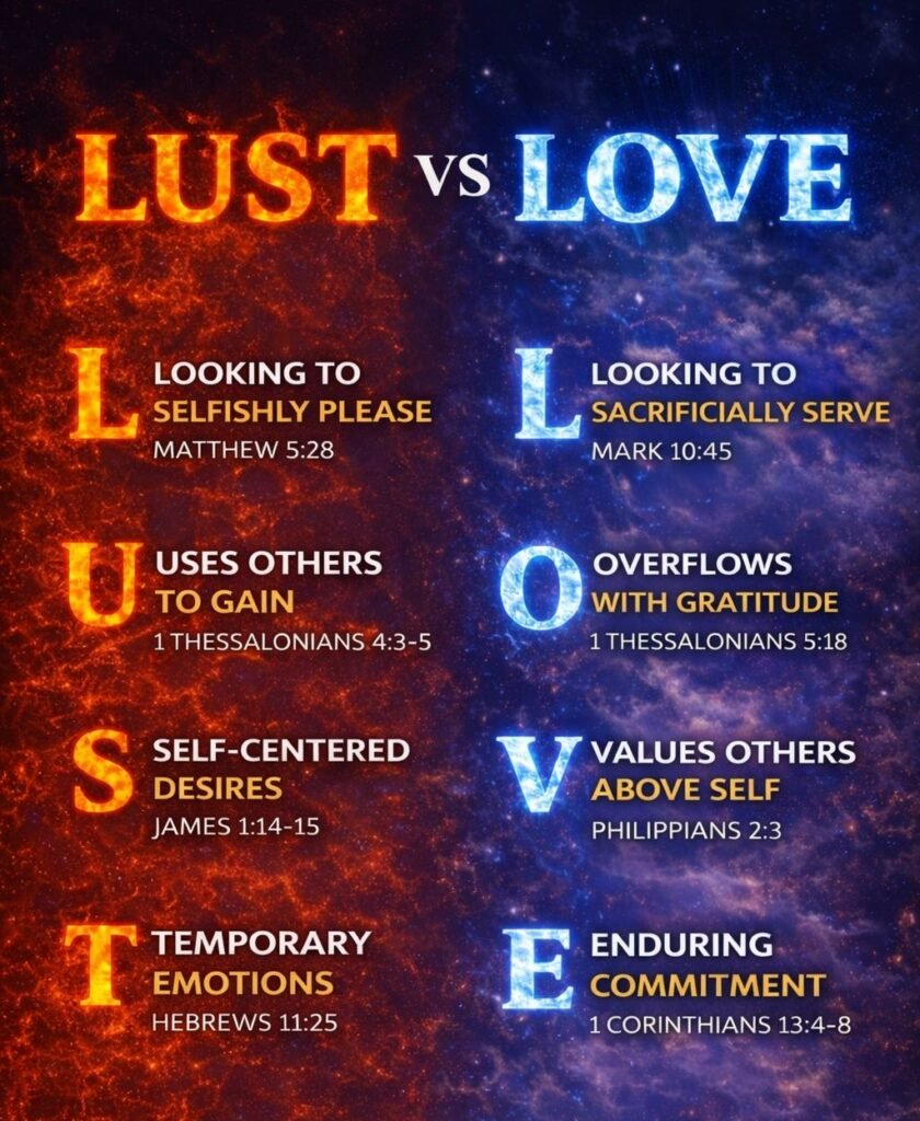 In the final analysis, Paulβs teaching presents two fundamentally different ways of living. Lust is characterized by self-reference, immediacy, and instability. Love is marked by other-centeredness, endurance, and spiritual vitality. Both involve desire, but they differ in direction and destination.