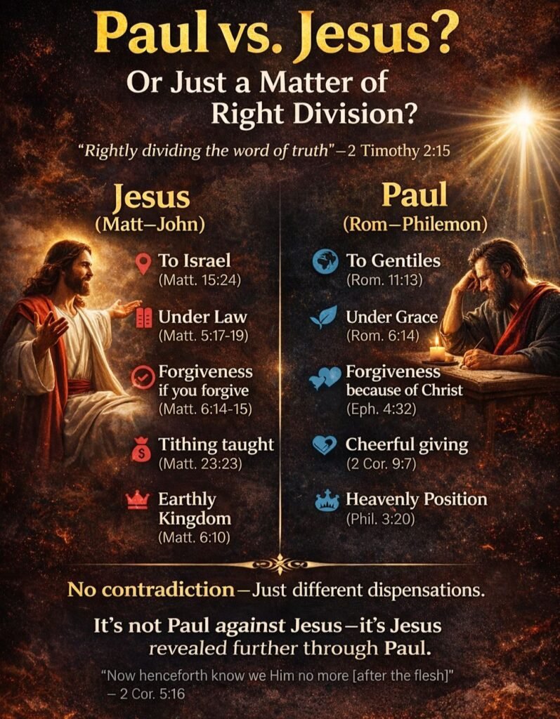 Many stumble when they read Jesus’ earthly ministry and Paul’s epistles side by side. They ask, β€œWhy does Jesus say one thing and Paul another?” The answer is not contradictionβ€”but dispensation. The same Lord revealed truth progressively, administering His will differently across time. When we rightly divide, harmony replaces confusion, and grace shines clearly.