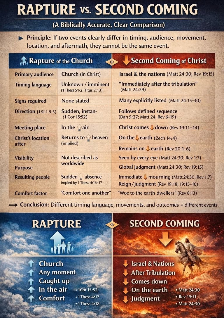 Confusion in prophecy comes when believers merge events God has separated. The Rapture and the Second Coming differ in timing, audience, purpose, movement, and outcome. If two events are clearly different in Scripture, they cannot be the same event. Right division brings clarity, comfort, and confidence.