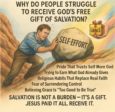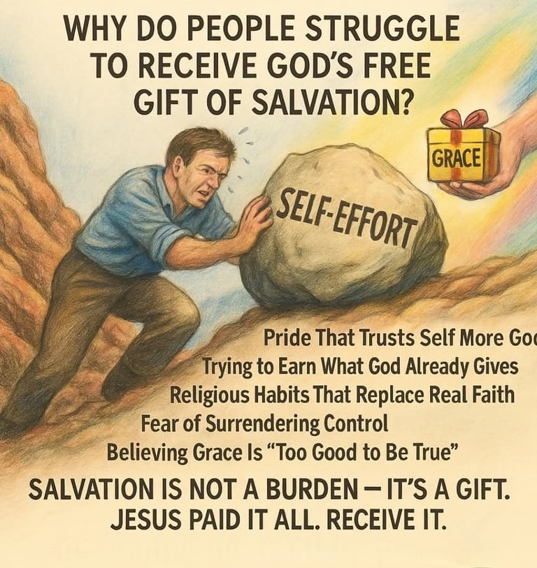 Man struggles with salvation not because the gift is unclear, but because the heart is unwilling. Pride, performance, religion, fear, and unbelief all compete with grace. But Godโs gift remains unchanged โ free, full, and finished.