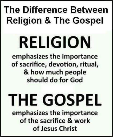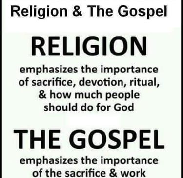 Religion is manโs attempt to reach God through rituals, rules, and requirements. The Gospel is Godโs good news that He reached man through Christโs finished work. Under the Law, Israel had religion; under Grace, the Body of Christ has the Gospel. Confusing the two leads to bondage, but rightly dividing the Word (2 Tim. 2:15) sets us free in Christ.