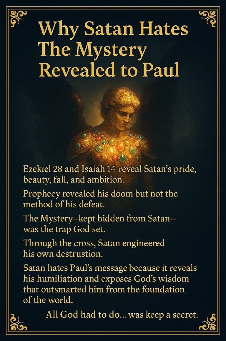 He hates Paulโs message because it reveals: How God outmaneuvered him from the beginning simply by keeping His plans to reconcile the Heavens a secret.