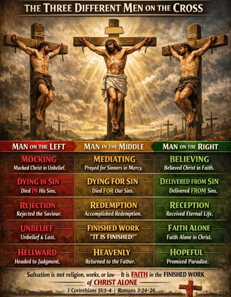 The scene offers no neutral ground. Each man responded decisively to Christ, and those responses continue to frame the essential question of salvation. In the dispensation of grace, Scripture makes clear that redemption is not secured through religious effort, moral improvement, or adherence to law. Salvation rests entirely on faith in the finished work of Jesus ChristβHis death, burial, and resurrection (1 Corinthians 15:1β4).