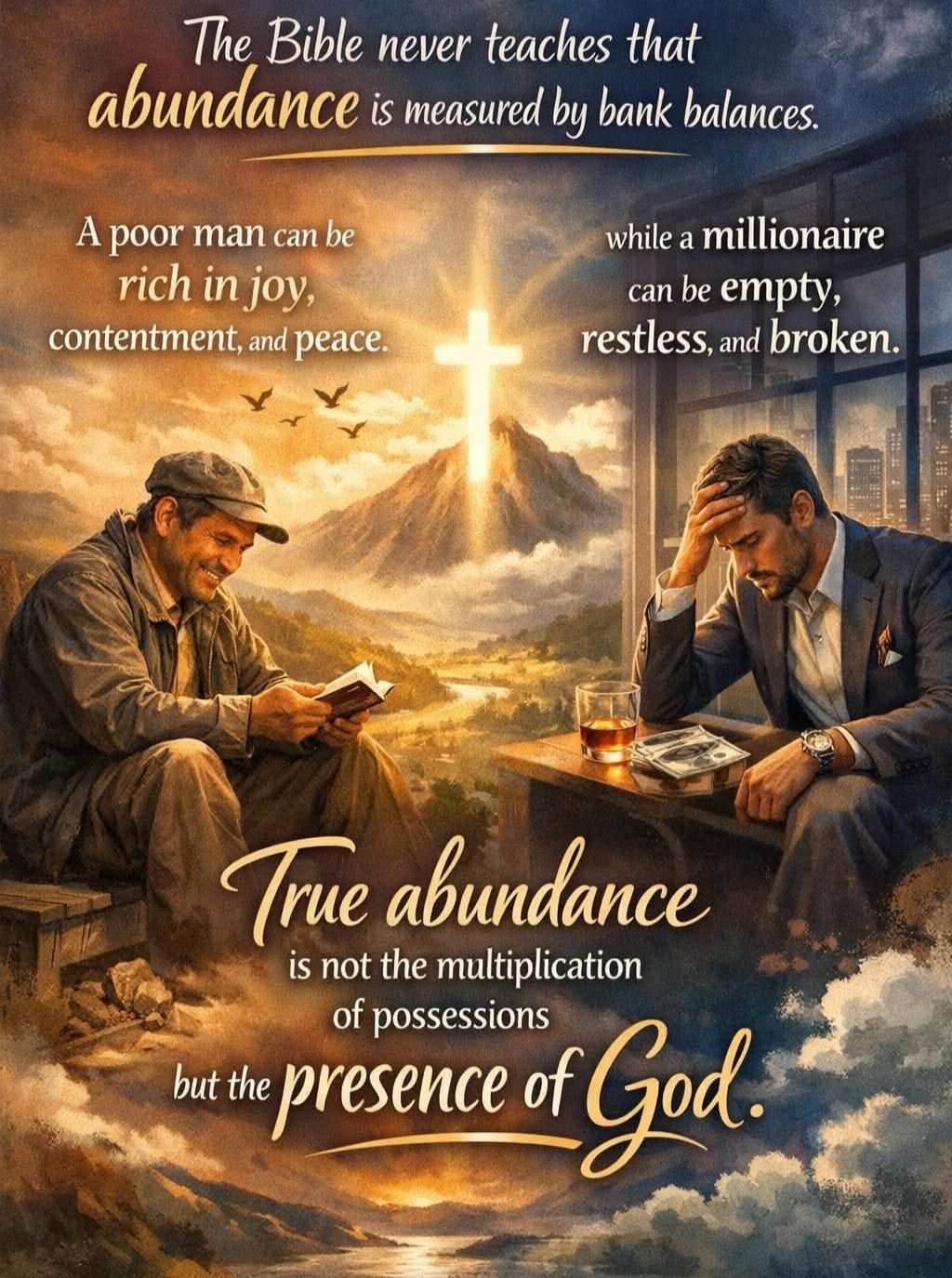 Money cannot satisfy the soul Godβs presence brings true joy Grace teaches contentment Provision is promised, not luxury Heaven is our treasure Christ is our abundance Glory outweighs gold Contentment is learned God Himself is enough