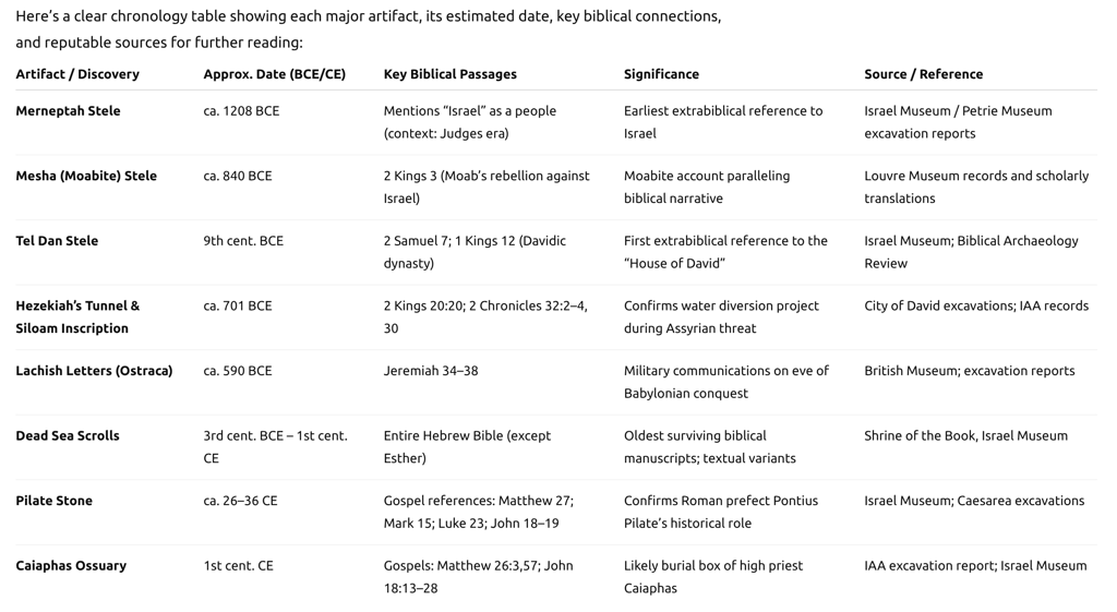 This long-form report surveys the major archaeological discoveries most directly related to persons, places and events in the Bible, explains what they do and do not prove, and places them in the context of modern historical method. It draws on primary excavation reports and reporting from leading institutions: the Israel Antiquities Authority, the Israel Museum, peer-reviewed journals and established archaeology outlets. Where claims have been contested, the article explains the controversy and the current scholarly consensus. imj.org.il+2Biblical Archaeology Society+2