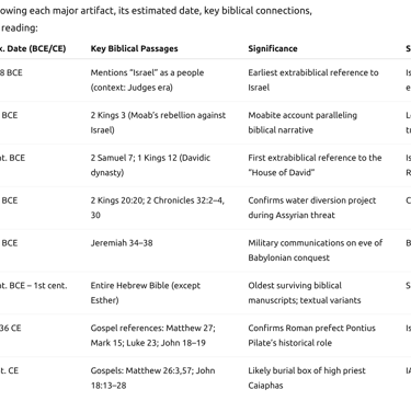 Archaeology does not issue verdicts of belief. It provides a material conversation partner for ancient texts: trowel marks, carved letters, fragments of leather and clay that speak across millennia. In many important cases—epigraphic references, administrative artifacts and preserved manuscripts—archaeological evidence confirms that the world described in the Bible had concrete historical contours recognizable to modern scholars. In other cases the material record complicates simple readings and forces historians to pay attention to nuance: political propaganda, textual pluralism, and the vagaries of survival.