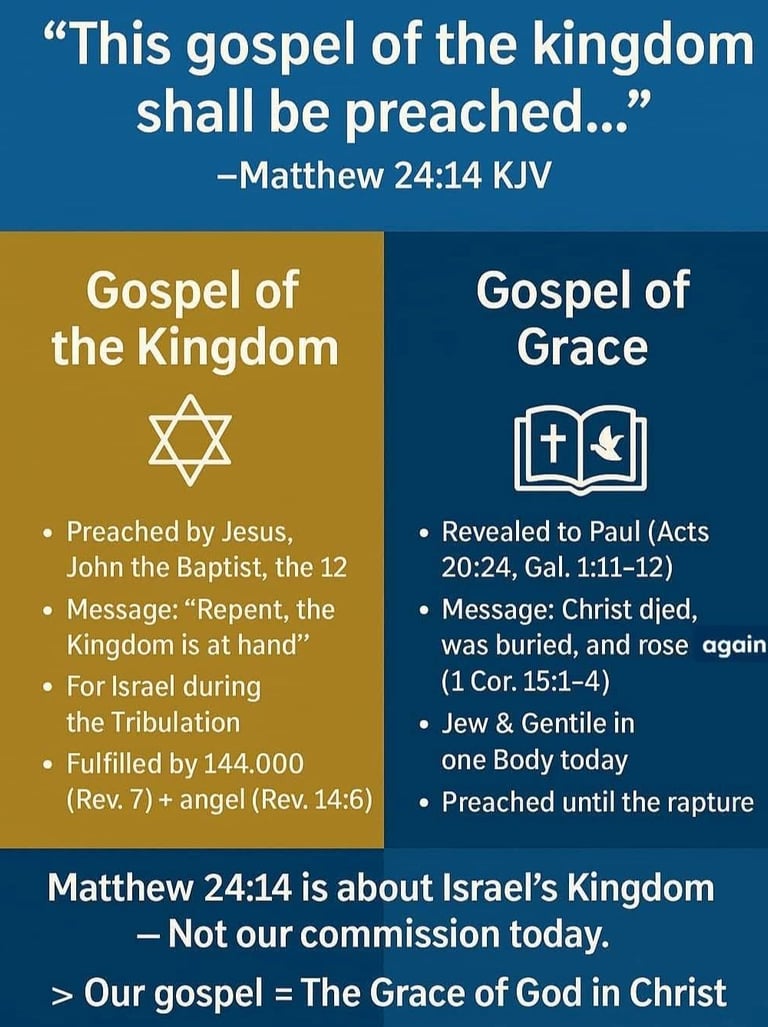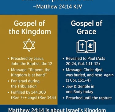 Matthew 24:14 is not about us todayโit is about Israel in the future tribulation. The kingdom gospel will be preached as a witness before Christ returns to establish His kingdom.