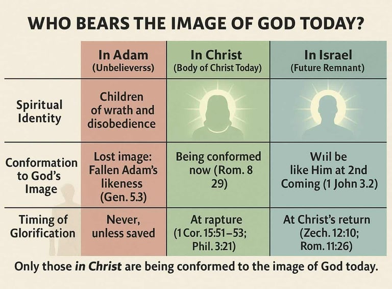 Today, only those in Christ bear the image of God. The lost remain in Adamโs fallen image, while Israel awaits her future restoration at Christโs return. The Body of Christ is presently being conformed to Christโs image and will be glorified with Him in heaven.